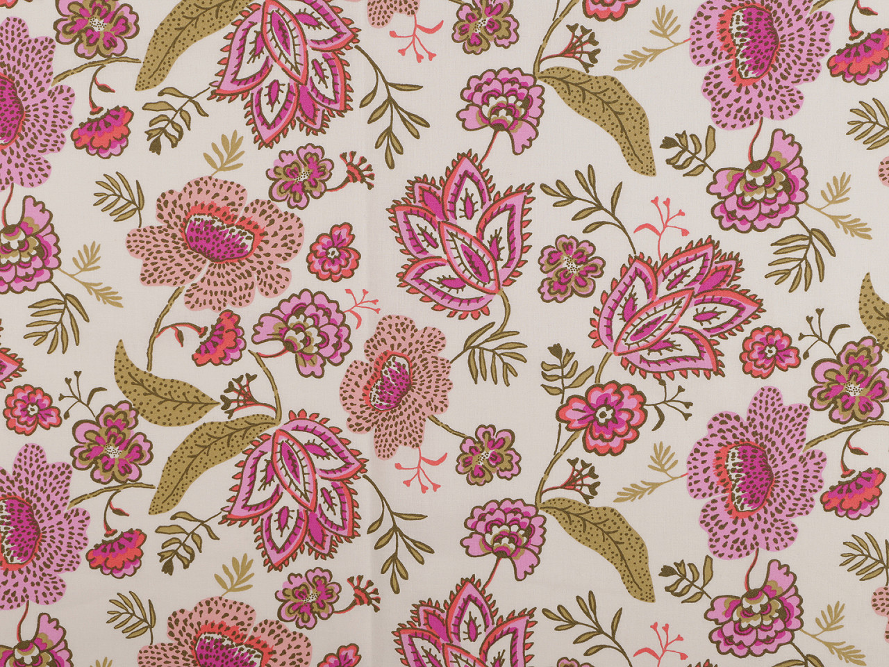 Bavlněná látka s [květinovým vzorem] je vhodná na šití polštářů, povlečení, závěsů, ubrusů, tašek, pytlíků a různých bytových dekorací.