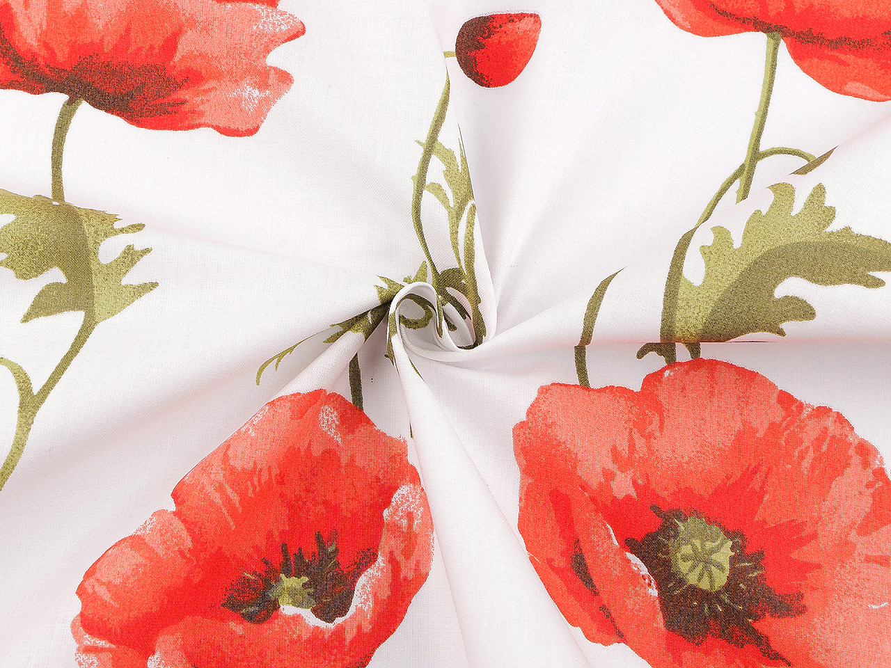 Bavlněnou látku využijete na šití polštářů, povlečení, závěsů, ubrusů, tašek, pytlíků apod. Výrazný vzor vlčího máku dodává látce svěžest a romantický nádech.