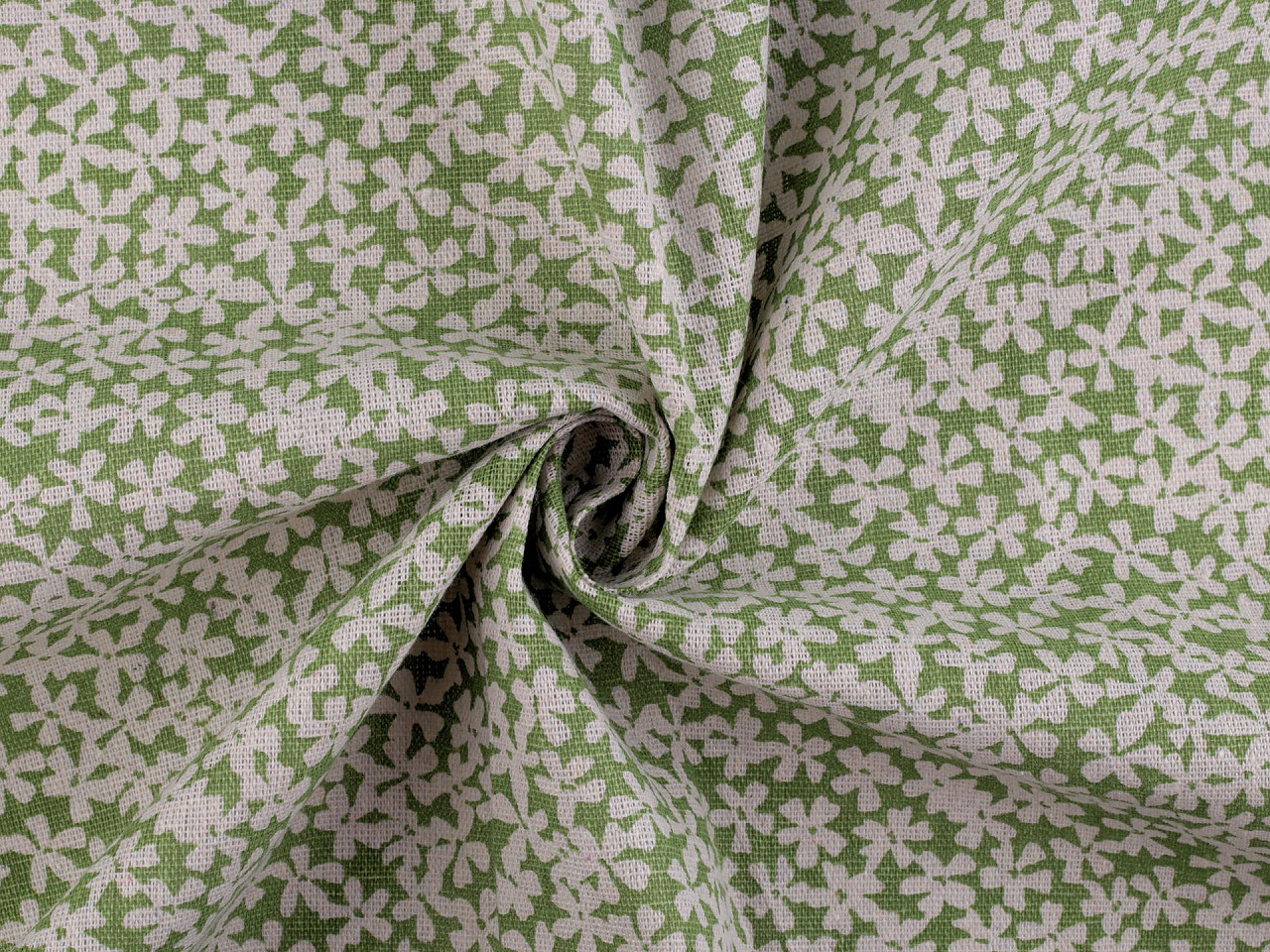 Bavlněná metráž / imitace lnu hrubší, květy, střední, 2 zelená sv.