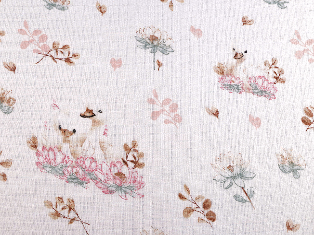 Bavlněná plenkovina s [roztomilými motivy hus] je vzdušná a příjemná na dotek. Využijete ji na šití plenek, baldachýnů, bryndáčků apod.