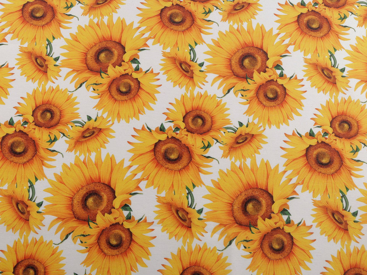 Pevnou dekorační látku se slunečnicemi využijete na šití ubrusů, prostírání, povlaků na polštáře, podsedáků a dalších bytových dekorací. Můžete z ní ušít i tašky.