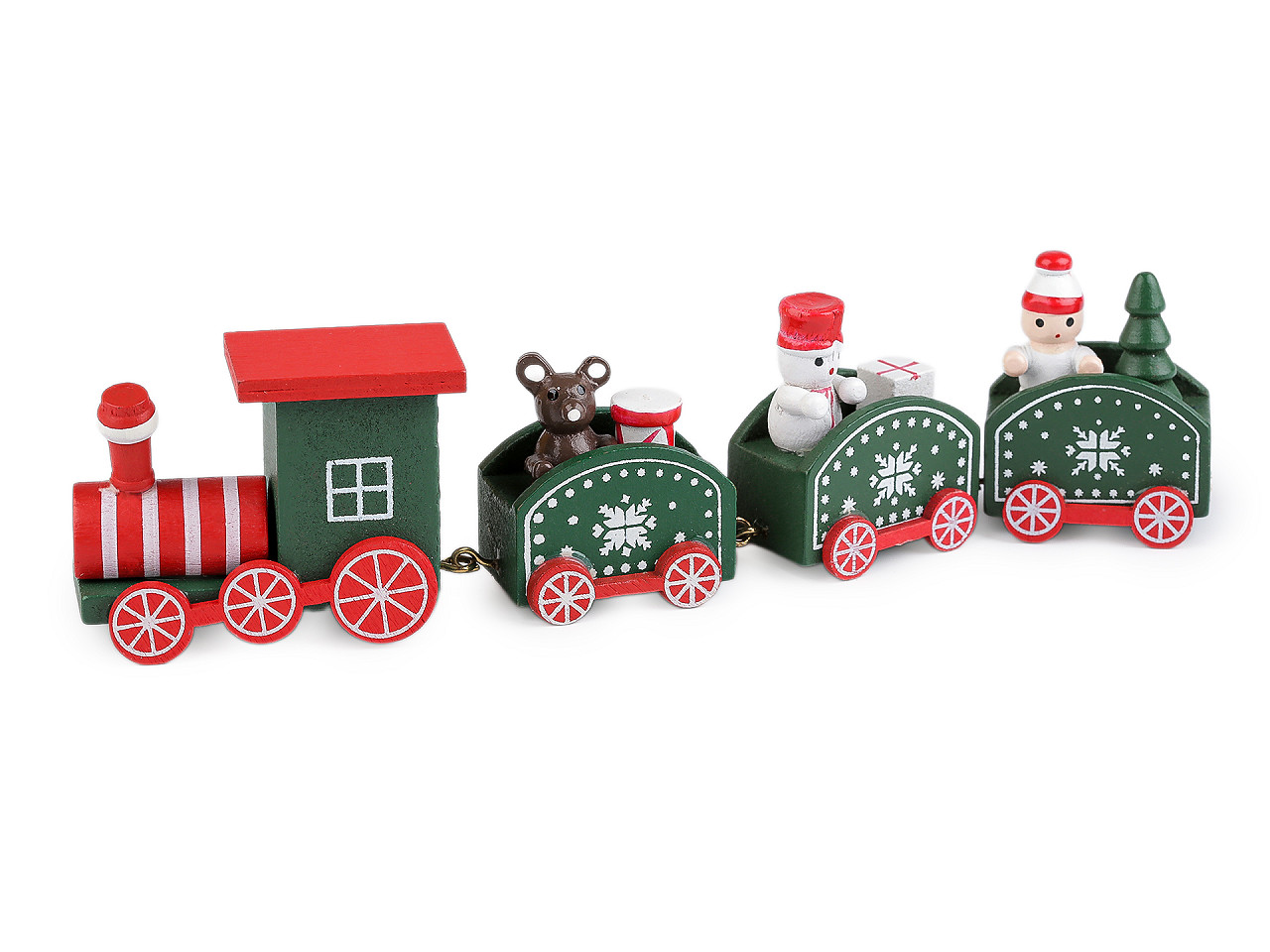 Malý dřevěný vláček rozněžní srdce dětí i dospělých. Mašinka za sebou tahá tři vagóny s dekoracemi v podobě medvídka, sněhuláka a panáčka. Vagóny jsou z obou stran ozdobené malbou. Spojují je kovová očka, nedají se odpojit.