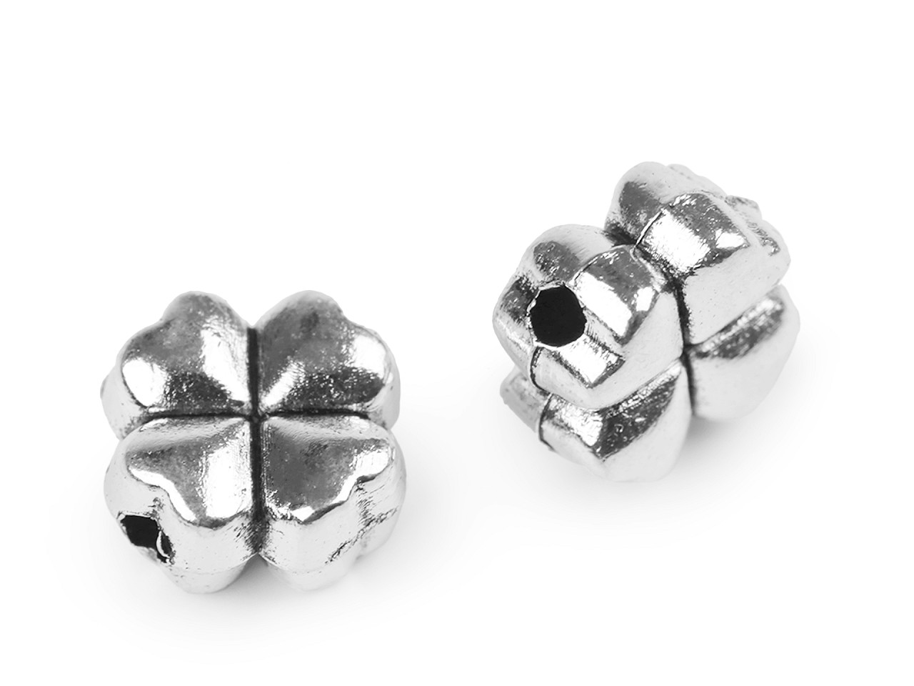 Kovový korálek čtyřlístek můžete využít jako talisman pro štěstí. Je oboustranný, průvlek má umístěný z boku.