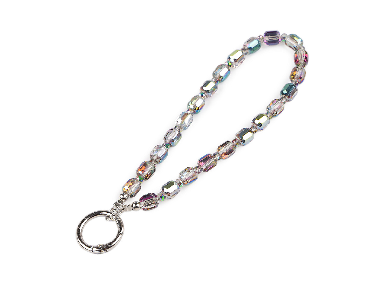 Přívěsek na mobil ze skleněných korálků s AB efektem je elegantním a stylovým doplňkem pro každý mobilní telefon. Vašemu zařízení přidá osobitý šmrnc a zároveň jej bude chránit před ztrátou či pádem. Můžete jej použít nejenom jako přívěsek, ale také jako poutko na ruku. Díky svému atraktivnímu designu oživí každou kabelku, tašku či batoh. Můžete jej použít i jako klíčenku, na konci má kulatou otevírací karabinu. Součástí balení je i plastová vložka, která se vkládá pod kryt mobilu.