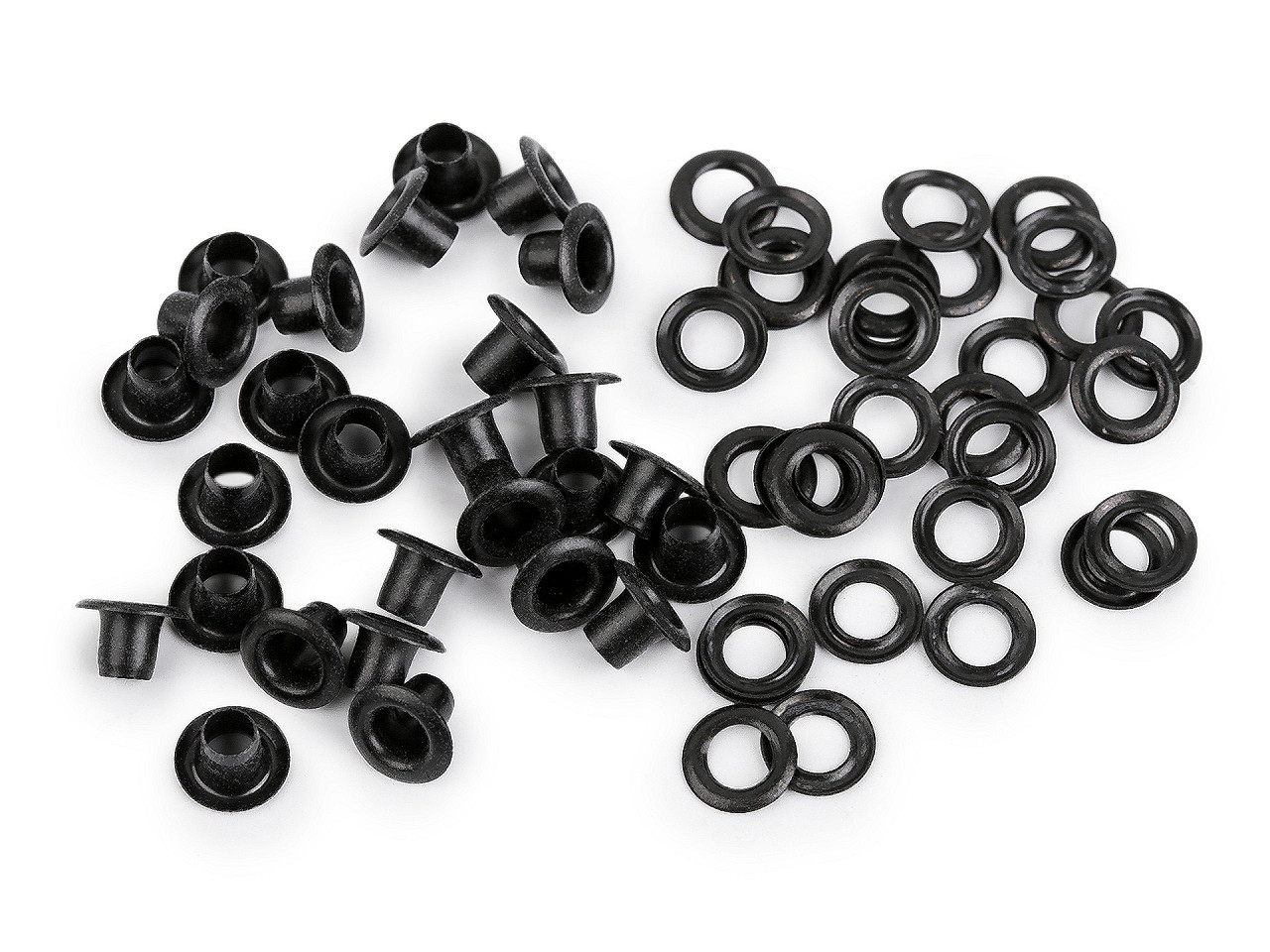 - Průchodky s podložkou vnitřní Ø4 mm / vnější Ø7,5 mm na silnější látky, střední, 1 černý lak