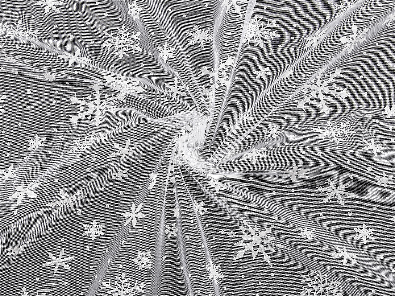 Vánoční tyl zdobí potisk sněhových vloček. Je jemný, měkký a pruží více po šíři. Využijete ho na šití závojů, sukýnek, karnevalových kostýmů i různých dekorací a zimních aranžmá.