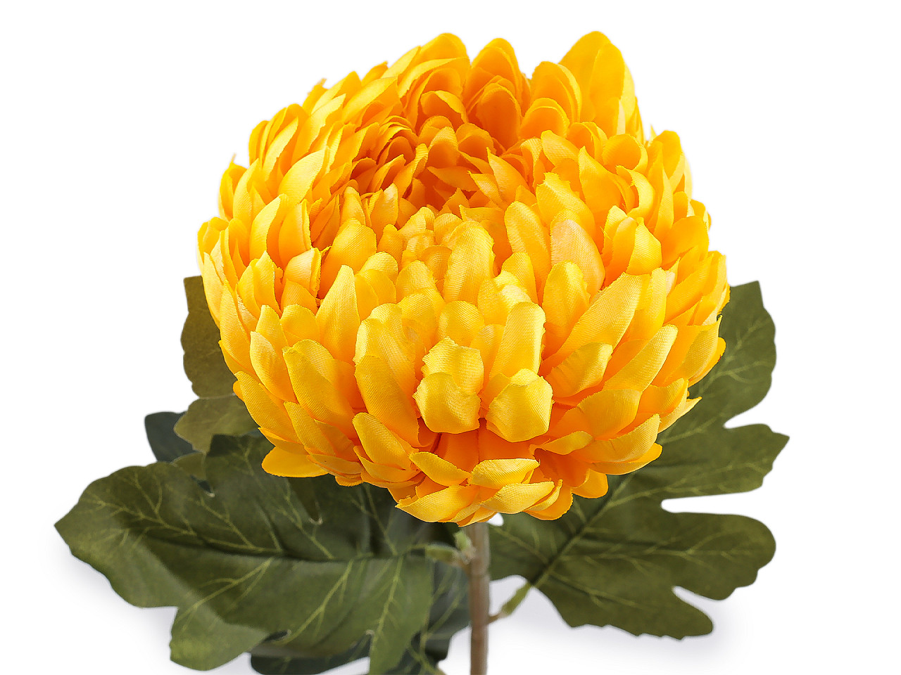 Umělá chryzantéma se pyšní svou velikostí. Květ a listy jsou textilní. Uvnitř stonku je drát. Chryzantémy vyniknou v jednoduché váze, ale také je využijete k aranžování květinových vazeb, věnců i ikeban.