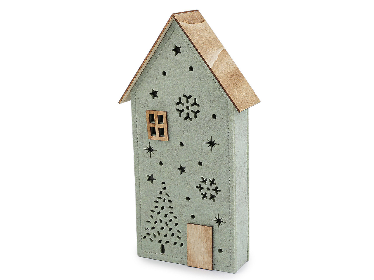 Svítící dekorační domeček má základ z pevného filcu a střechu a detaily ze dřeva. Ze přední strany má výřezy v podobě vloček, hvězdiček a stromečku. Svítí příjemným teplým světlem. Zútulní každý interiér.