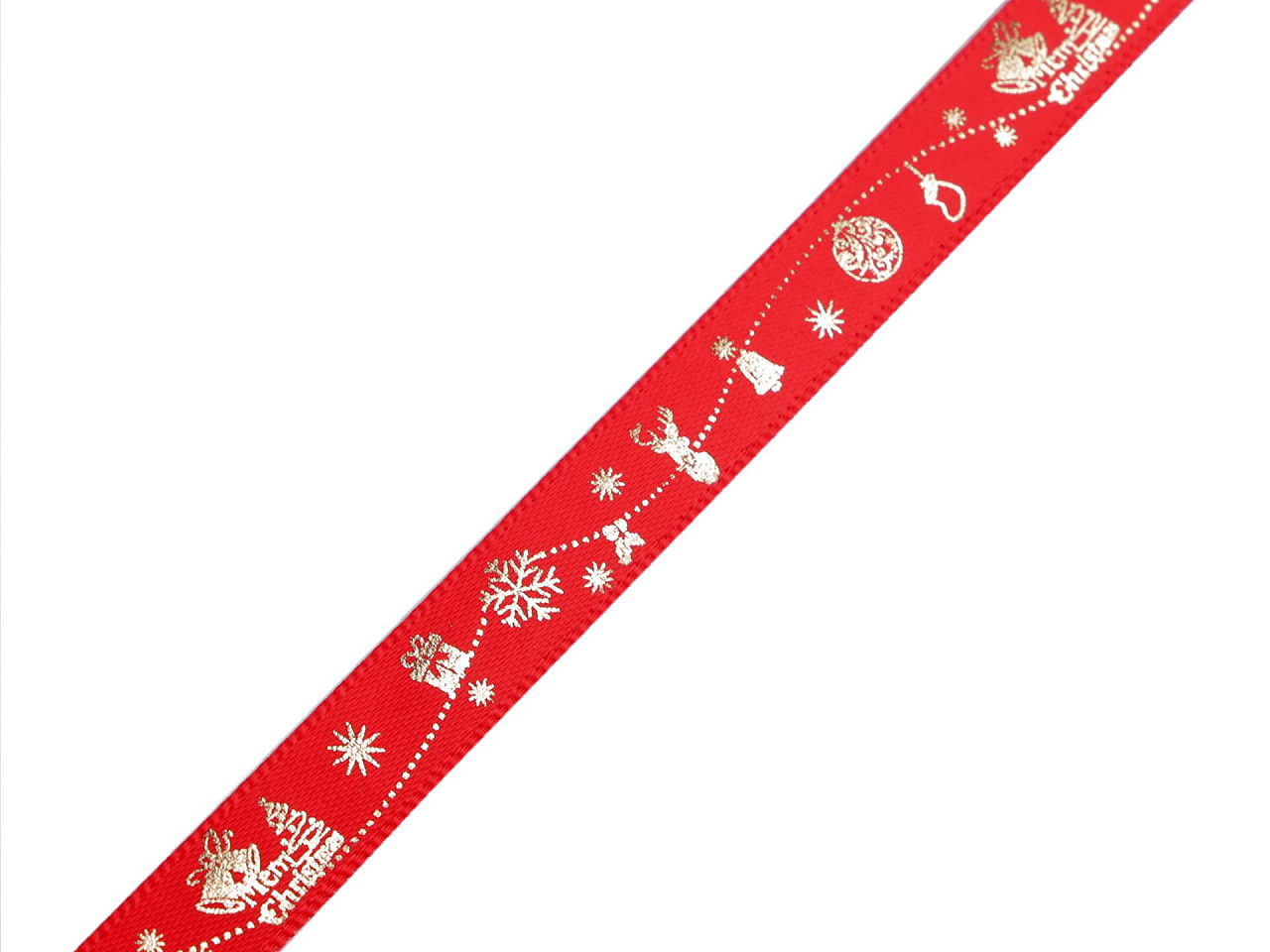 Dekorační saténová stuha s vánočním motivem. Potisk je jednostranný, metalický.