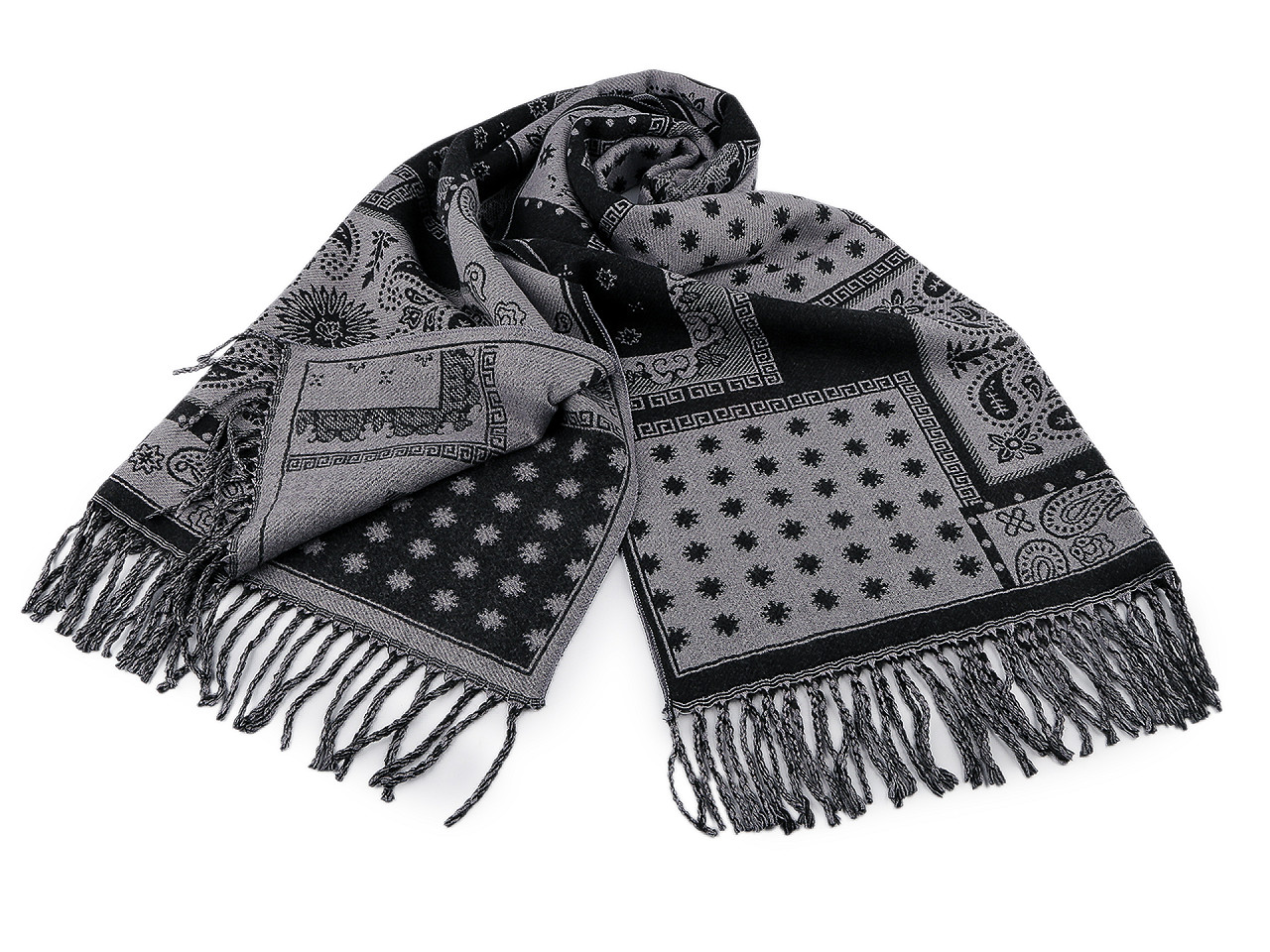 Oboustranná vzorovaná šála vás perfektně zahřeje v sychravých dnech. Je vyrobená z příjemně měkkého a jemného materiálu. Na koncích je zakončená dlouhými třásněmi.